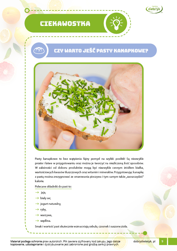 Dodatkowo do opracowanego planu dietetycznego otrzymasz atrakcyjnie przygotowane ciekawostki i wiadomości żywieniowe, które mam nadzieję pozwolą Ci zrozumieć wiele spraw związanych z nurtującym Cię problemem, a także przyczynią się do zwiększenia ogólnej wiedzy żywieniowej.